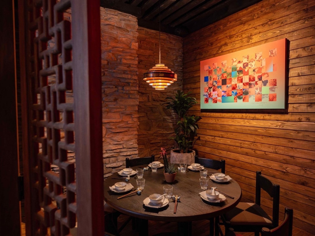 When customers go into the restaurant, they are welcomed by a large dining area with booth seats and high-top tables lining one wall, and a bar on the other. For bigger gatherings, a second dining area with curving banquettes is available, divided by conventionally patterned screen panels. This area also includes a semi-private dining space, providing versatility for different dining occasions. The interiors are adorned with artificial live-edge stones, creating a natural yet sophisticated aesthetic. Dark-stained exposed wooden beams run the length of the restaurant, adding a rustic charm. Large statement paper lanterns, decorated with famous ancient Hangzhou poems written in Chinese calligraphy, hang above both dining rooms, adding an authentic cultural touch.