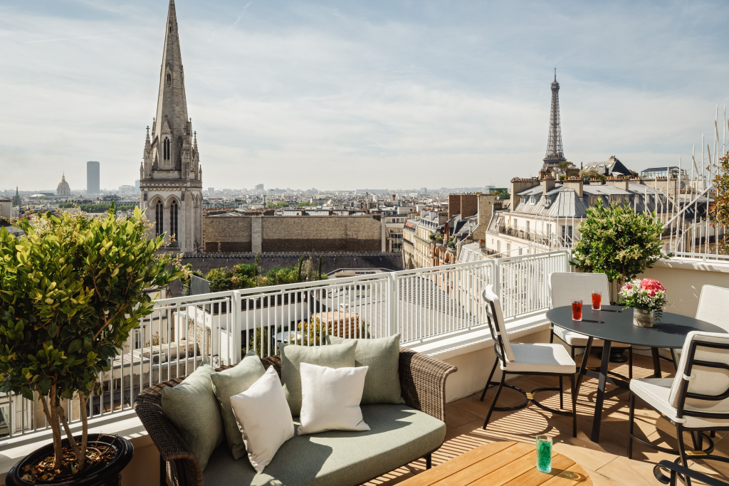 The hotel's top-floor Signature Suites, including the Eiffel Suite and the Panoramic Suite, offer expansive city views and bespoke interiors. Nearly half of all rooms and suites include private terraces, many with views of the Eiffel Tower. The glass-canopied courtyard has been transformed into a green urban retreat, while a 22-meter gallery lined with family portraits provides a dramatic welcome. Completing the experience is a new wellness space in partnership with Calma Paris, featuring a hammam, sauna, massage room, and fitness studio.