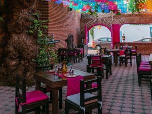 Stepping inside the restaurant, guests are greeted by a charming blend of rustic elegance and traditional Mexican decor. The courtyard setting, enhanced by lush greenery, vintage wooden tables, and vibrant red walls, offers a picturesque backdrop for an evening of indulgence. Overhead, twinkling string lights add to the cozy yet sophisticated atmosphere, making it an ideal spot for both intimate dinners and lively gatherings. The presence of a live mariachi band enhances the experience, adding a festive touch to the already vibrant ambiance.