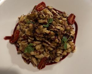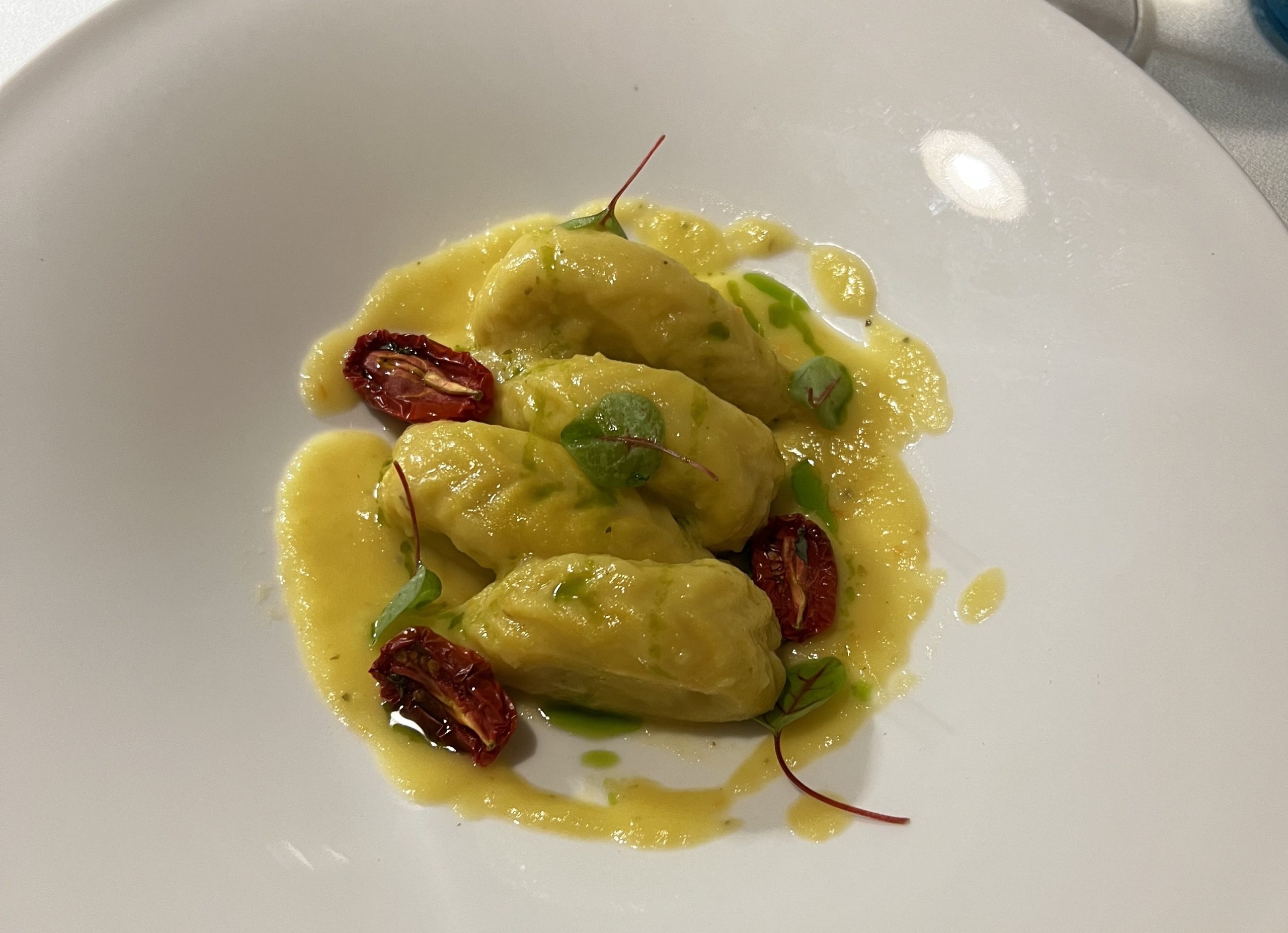 If you are looking for an exceptional way to start your meal, don't miss out on the enticing Red shrimp delicately marinated in green lemons, luscious organic yogurt foam, refreshing water ice, passion fruit, and aromatic mint. It is an exquisite culinary delight that combines a variety of contrasting flavors to create a harmonious dish. The addition of organic yogurt provides a creamy and velvety element that perfectly complements the seafood. As the first course delights your taste buds, savor the flavors of Black culurgiones pasta combined with seafood, marinated tomatoes, Sardinian pigs cheek, and red onion cooked sous vide style. The culurgiones, a traditional stuffed pasta, have a striking jet-black color due to the addition of squid ink. This not only gives the dish an elegant presentation but also adds a subtle briny taste that complements the seafood perfectly.
