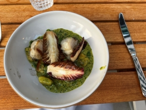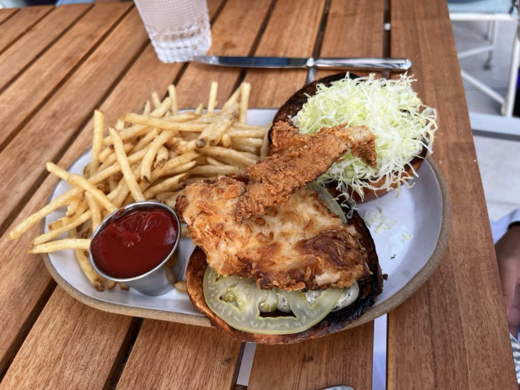Stepping into the establishment, you’ll immediately notice its modern yet comfortable design. The main dining area, known simply as The Tavern offers 100 indoor seats and a long, inviting bar. This vibrant space acts as the heart of the dining experience, encouraging guests to gather and enjoy both the ambiance and the fare. The Bottle Room, with its charming wood-paneling and China-lined walls, offers an intimate dining option perfect for private events. For those who prefer outdoor dining, The Terrace provides a lush, green haven with trellises and al fresco seating, making it an ideal spot for meals by the sea.
