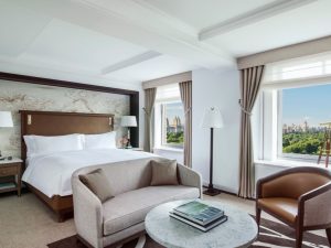 Guests are welcomed upon arrival with a sophisticated main lounge boasting high ceilings and a comfortable seating area exuding elegance. Each clean, modern room features a marble bathroom. The soothing palette of light colors and meticulously crafted wood furniture exude understated luxury. Many rooms offer sweeping views of Central Park or the city skyline, capturing the essence of New York City.